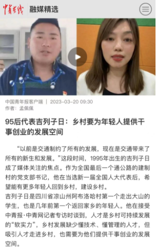今年全国两会上,作为全国最后一个通公路的建制村的党支部书记,1995年出生的吉列子日当选新一届全国人大代表后,希望能有更多年轻人回到乡村,建设乡村。