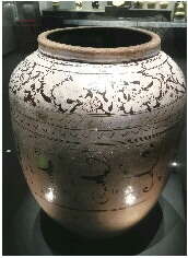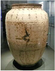 酒须豪饮,但不要贪杯。同样还是盛酒器,也有控制酒量的广告词。如邯郸博物馆陈列有一件明代白釉褐花酒海(如图②)。口沿下书一圈文字:“隆庆五年(1571年)二月,韩氏吉造酒海”。酒海是古代对大型盛酒容器的称谓。如唐代诗人白居易在《就花枝》诗中就写到酒海——“就花枝,移酒海,今朝不醉明朝悔。”我们熟悉的小说《水浒传》第八十二回中:朝廷派宿太尉带着御酒去梁山招安,在宣读完诏书后,“(宿太尉)叫开御酒,取过银酒海,都倾在里面,随即取过镟杓舀酒,就堂前温热,倾在银壶内。”古代一些场合,尤其是在基层民众中,酒要像《水浒传》里描绘的那样用勺子或瓢舀着喝,酒海因为体形庞大且易于饮者取放饮用,因此广受追捧。有意思的是在酒海肩部还写有一篇词:“贤良是孟江(姜),孝顺是王祥。在家敬父母,何须远烧香。女贤是孟江(姜),二郎担山赶太阳。三人哭活子(紫)荆树,王祥卧兵(冰)救亲娘。”(如图③)