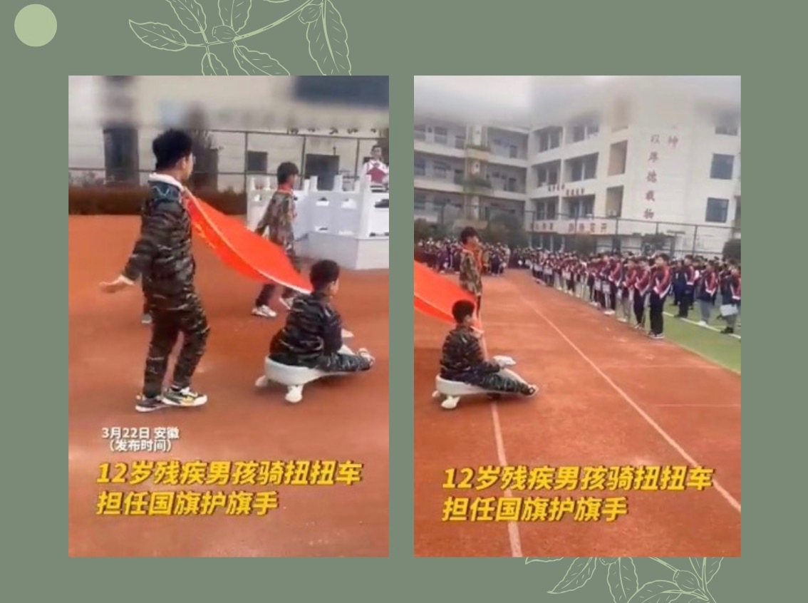 近日,在安徽亳州,一名残疾男孩骑扭扭车担任国旗护旗手。任务完成后,一名同伴还不忘记照顾身体不便的男孩。网友:为有温度的学校和同学点赞!