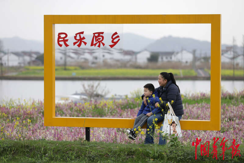 3月25日,浙江绍兴东鉴湖畔,一位母亲带着孩子坐在在油菜花丛边的艺术画框上休息。中青报·中青网记者 陈剑/摄