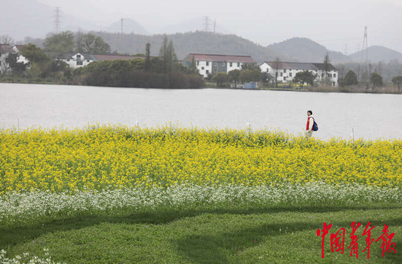 3月25日,浙江绍兴东鉴湖畔,一名男子在油菜花丛边驻足。中青报·中青网记者 陈剑/摄