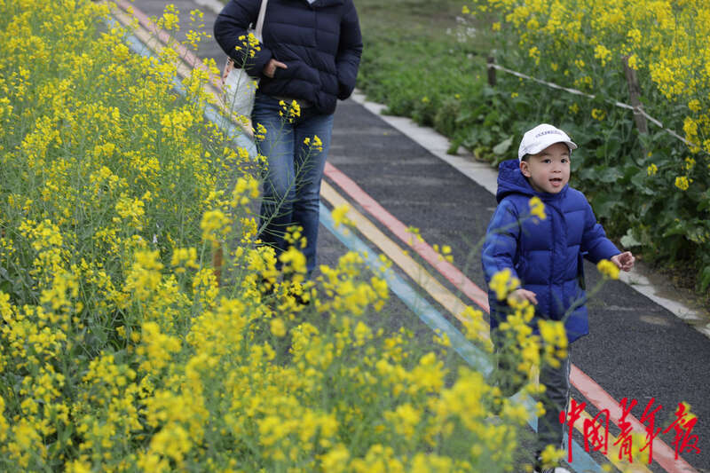 3月25日,浙江绍兴东鉴湖畔, 一位小朋友在油菜花丛中的步道上快乐地奔跑。中青报·中青网记者 陈剑/摄