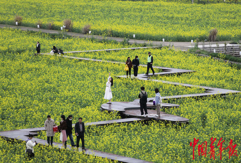 3月25日,浙江绍兴东鉴湖畔,游人在油菜花丛中的步道上漫步。当日,第四届鉴湖湿地油菜花节在这里正式启动,千亩湿地油菜花田吸引着游客纷纷前来打卡。近年来,当地所处的绍兴市越城区陶堰街道,以花为媒,依托湿地,将绿水青山转化为金山银山,铺就乡村振兴的美丽画卷。中青报·中青网记者 陈剑/摄