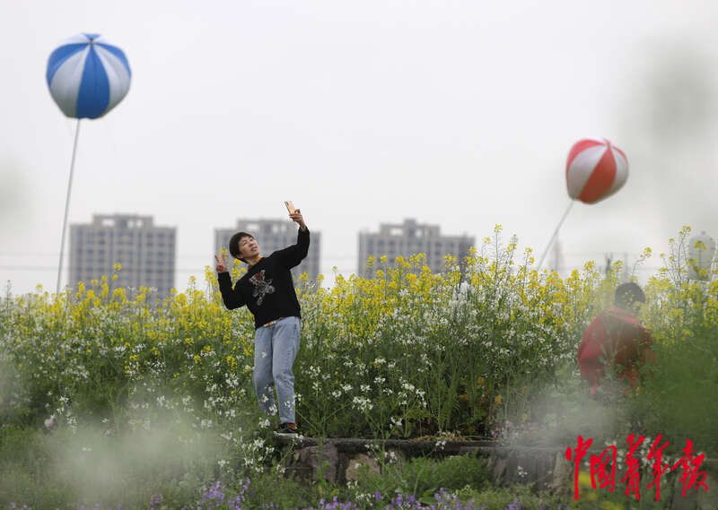 3月25日,浙江绍兴东鉴湖畔,游人在油菜花丛中拍照留念。中青报·中青网记者 陈剑/摄