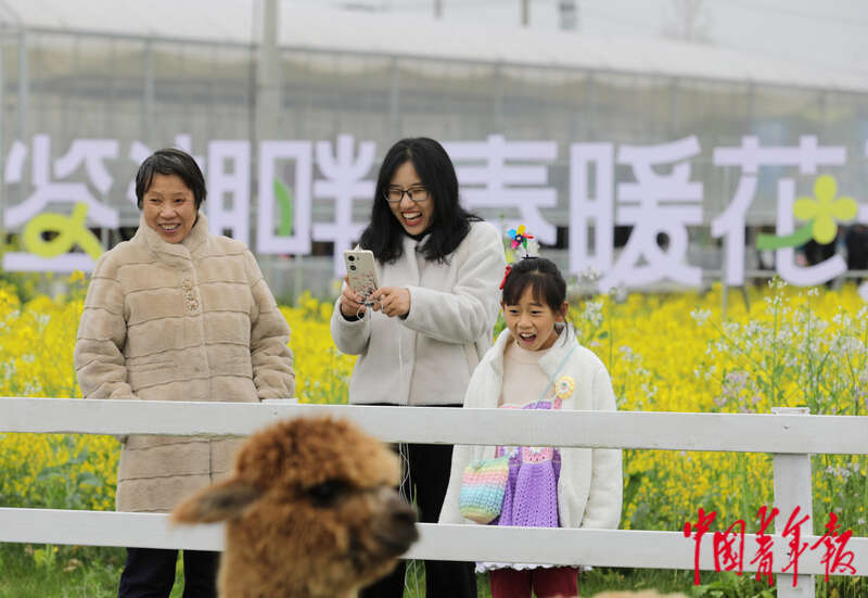 3月25日,浙江绍兴东鉴湖畔,游人在油菜花丛边的萌宠乐园,快乐地与羊驼打招呼。据介绍,今年的鉴湖湿地油菜花节时间为3月25日至4月9日,在活动期间,市民和游客可以参加萌宠乐园、安澜集市、围炉煮茶、草坪露营、画舫游湖等活动。中青报·中青网记者 陈剑/摄