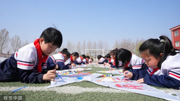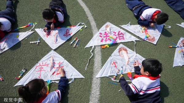 2023年3月27日,河北邢台,平乡县司法局联合平乡县县直第三小学,举办了手绘法治风筝放飞活动。在普法志愿者和老师的指导下,小朋友们在风筝上进行法治绘画,用稚嫩的双手描绘着他们对“法治”的理解,孩子们在寓教于乐中潜移默化地接受法治的渲染。