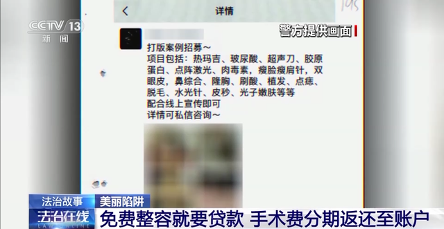 如果真能按照医院广告宣传的免费整容,相当于省了几十万元,蔡女士心动了。但免费的条件同样是要在某网贷平台上申请为期一年的分期贷款,用于支付手术费,之后按要求在朋友圈帮医院做宣传,手术的费用会分12个月返还至蔡女士的账户内。
