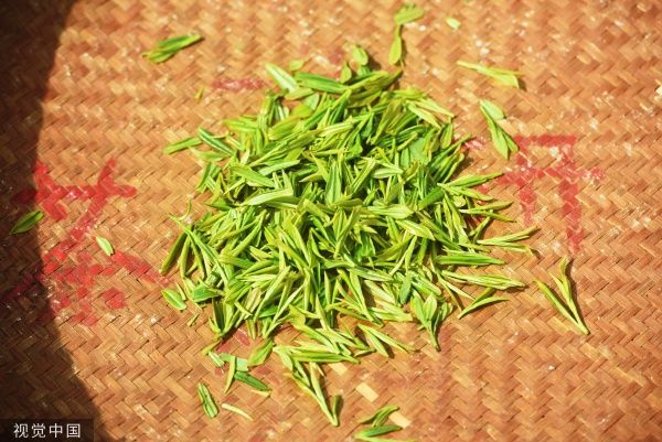 2023年3月28日,杭州西湖区,AI采茶机器人在西湖龙井原产地一级保护区的茶园里采摘西湖龙井明前茶的嫩芽。