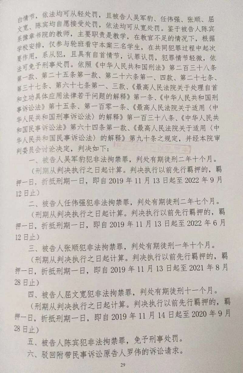 一审判决书显示,吴军豹被判处有期徒刑二年十个月,任伟强被判处有期徒刑二年七个月;张顺、屈文宽分别被判刑一年十个月、十一个月;陈宾也犯非法拘禁罪,但免于刑事处罚。