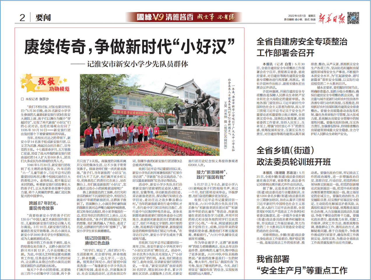 2023年3月5日,习近平总书记参加十四届全国人大一次会议江苏代表团审议,淮安市新安小学校长张大冬代表发言说:“孩子们听说我要来北京参加全国两会,他们有许多心里话想对总书记说。”习近平总书记高兴地回应道:“给孩子们问好啊!”2021年儿童节前夕,习近平总书记回信勉励新安小学五(8)中队少先队员,要“结合自身成长学好党史,以英雄模范人物为榜样,从小坚定听党话、跟党走的决心,刻苦学习,树立理想,砥砺品格,增长本领”。