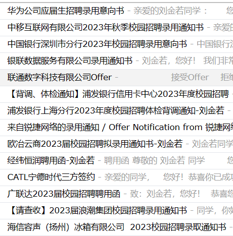 整个秋招刘金若一共投递了200+企业,60+企业进入了面试,最终收获18个offer。拿到多个offer才能有足够的选择余地,从而找到最适合自己的工作,而这的前提就是要海投。“我当时还在备考考研,所以只有每天熄灯前有时间投简历,积少成多,最后也投了相当多的企业。”其实很多公司尤其是国企,校招进程较慢,刚投递后没收到回复不要着急,机会还是非常多的。