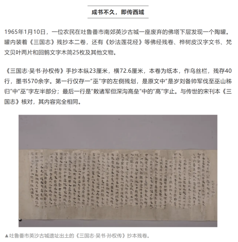 《三国演义》是中国人家喻户晓的古典名著。作为文学作品,其中带有文学性的描绘内容未必真实可信。要想真正了解三国历史,还是要读西晋陈寿的《三国志》。《三国志》写于公元3世纪末。令人意想不到的是,仅仅在几十年里,《三国志》就传入并流行于西域地区。现藏于新疆维吾尔自治区博物馆的《三国志·吴书·孙权传》和《三国志·魏书·臧洪传》抄本残卷,便是现存最早的《三国志》抄本残卷。