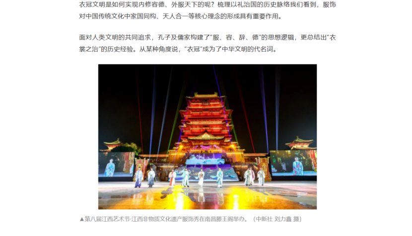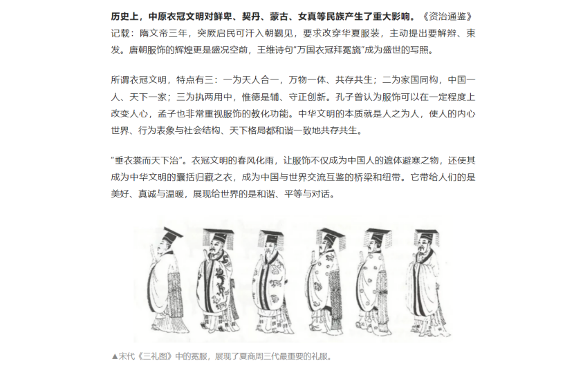 中华民族的服饰不仅具有避寒暑、御风雨、蔽形体的实用功能,还具有遮羞耻、增美饰、辨族群的社会功能,体现出知礼仪、别尊卑、正名分的教化功能,诠释着释乾坤、彰华夏、定天下的中华文明。