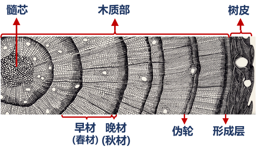 年轮,是树木木质部细胞进行有规律的生长和变化而形成的。在万物复苏的春季,树木形成层会快速分裂出细胞大、细胞壁薄的早材细胞,形成颜色较浅的春材(早材)。到了北雁南飞的秋天,形成层细胞停止分裂,晚期形成的木质部细胞个体小、细胞壁厚、颜色深,叫做秋材(晚材)。春材和秋材共同构成一个完整的年轮。当光热水肥充足时,形成层细胞分裂较快较多,容易形成宽轮;当气候环境条件不利、树木生存艰难时,就会形成窄轮。在极端干旱或寒冷的年份,树木形成层可能一个细胞也不分裂,就会“缺轮”。树木正常生长过程中,如果突遇寒流或短期干旱,形成层细胞分裂有时会短暂停止后又恢复,这样一年内就会形成多轮,称作“伪轮”。