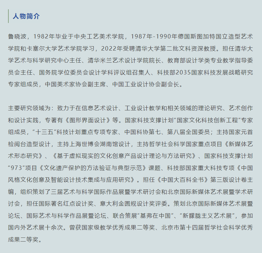 2022年初,鲁晓波入选清华大学文科资深教授。在他所提到的“设计”这条“有前途的路”上,他已经取得了不菲的成就,为中国设计学科的发展和国家的美育事业作出了卓越的贡献。