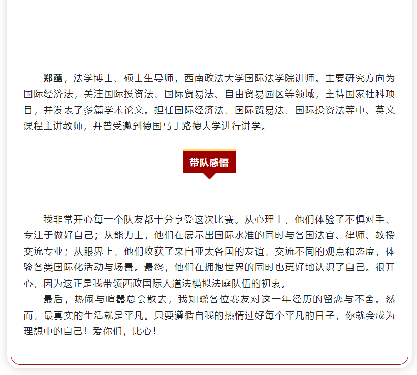 本人很荣幸能够代表学校参加此次亚太轮国际赛,在赛场上见识到了来自不同国家选手的风采。很高兴能够获得好的成绩,这也是西政获得的历史最佳成绩,希望以后会有更多西政学子加入比赛,领略人道法的魅力!