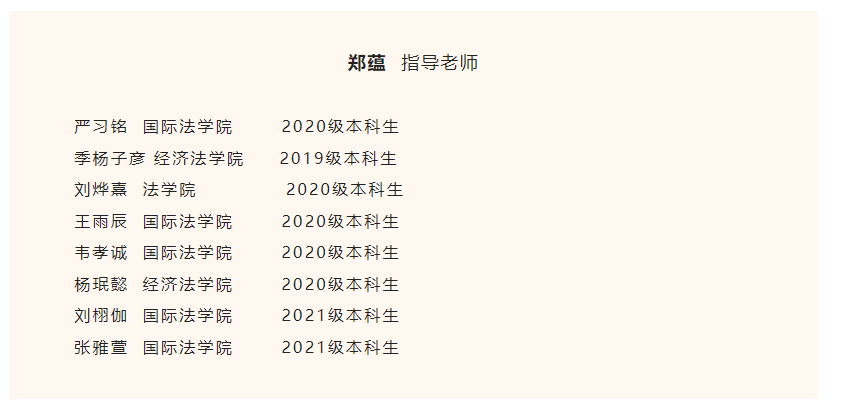 很有幸参与到本次国际人道法模拟法庭的备赛中,非常感谢郑老师、师兄师姐对我的帮助和指导,感谢遇到优秀的队友们。