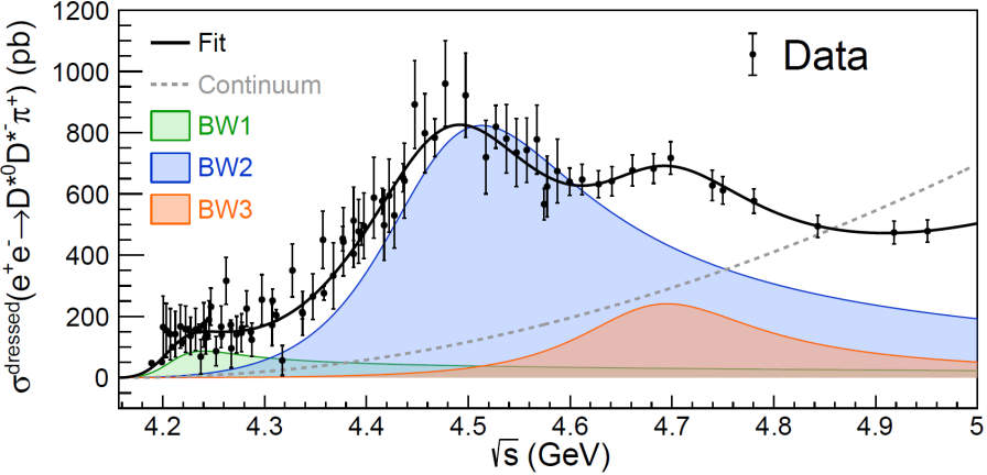 2023年3月23日,《物理评论快报》(Physical Review Letters) 正式发表了稀有同位素前沿科学中心、核科学与技术学院李培荣教授联合中国科学院大学粒子物理实验团队在北京谱仪III实验上主导完成的对显粲三体过程𝑒+𝑒− →𝐷∗0𝐷∗−𝜋+ 的产生截面测量工作。在截面线形分布上观测到了三个类粲偶素态,分别位于4.21GeV, 4.47GeV和4.68GeV,且宽度都大于50MeV。 这些类粲偶素态作为奇特强子态的候选者 ,与夸克模型预言的粲偶素有明显的区别。