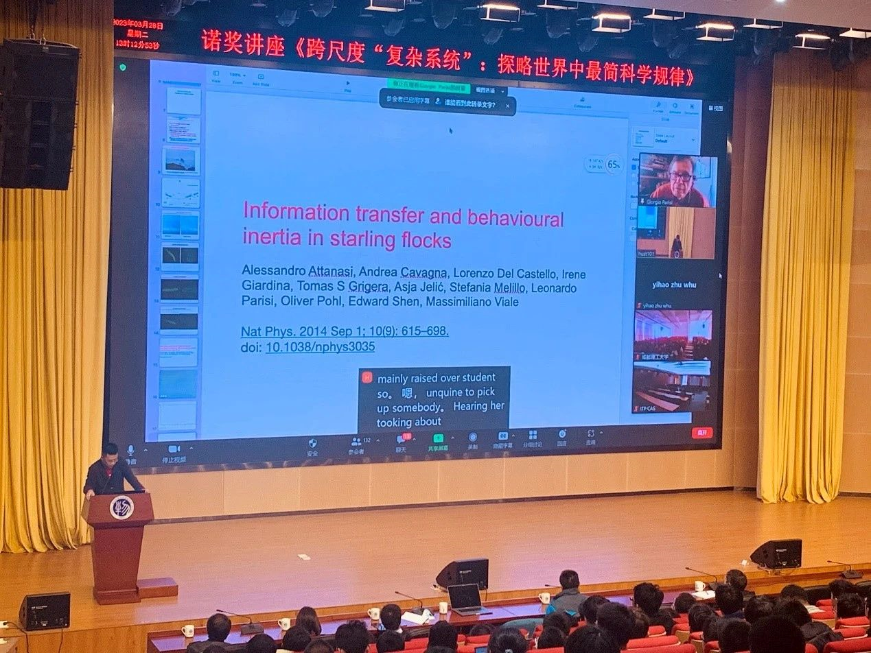 物理学院教授马怡秋:帕里西教授带来的精彩讲座为物理学院的同学们开了一扇新的窗口。生活中常见的鸟群运动这类现象中,也蕴含着深刻的物理原理,能够和统计力学和场论中的临界现象、对称性破缺等等重要的概念建立联系。这充分显示出理论物理是阐释自然现象的有力工具。