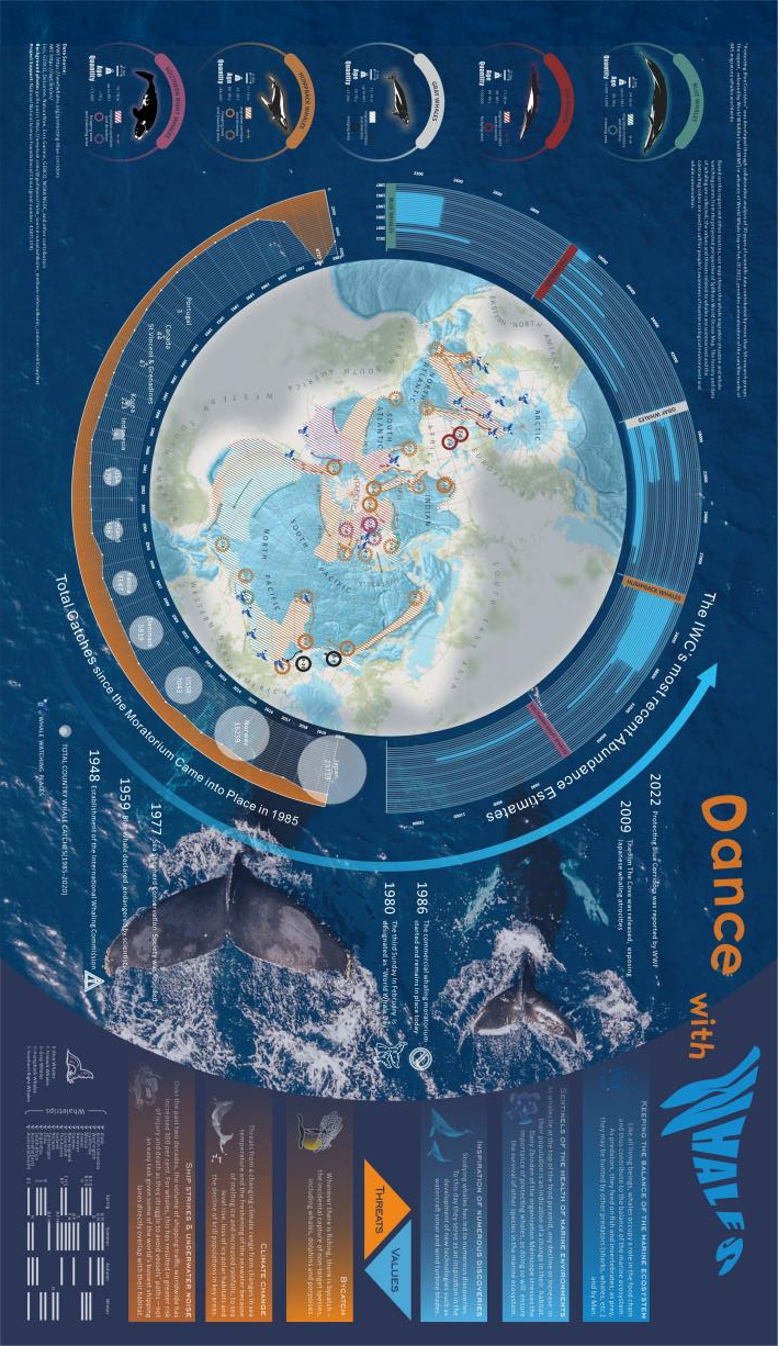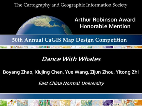华东师范大学地理科学学院地理科学拔尖班赵博旸、陈秀静、王玥、周子骏、智一桐等五名本科生合作的专题地图作品 Dance with Whales 凭借出色的设计质量,斩获2022年度“Arthur Robinson Award for Best Printed Map”Honorable Mention奖。