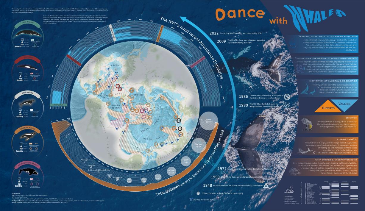 确定鲸鱼最重要的栖息地和迁徙路线,并通过直观有效的科普方式宣传展示,是提高人类的认知,保护鲸鱼的迁徙区域——蓝色廊道的重要任务。