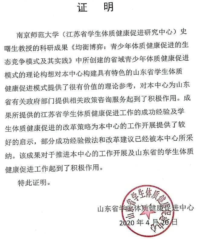 成果还被广东、山东、安徽等多个省的省级学生体质健康促进机构所借鉴应用,各省级健康促进机构借鉴成果中所总结的江苏省学生体质健康促进工程成功经验,完善了各自省份学生体质健康促进的机构设置、工作方案等,对各省域的学生体质健康促进工作的顶层设计、政策治理以及具体实践都产生了积极影响,为全面推进学校体育、学生体质健康等体育科研事业改革发展贡献自己的力量。