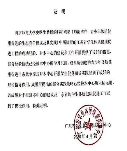2019年,全国政协副主席卢展工率工作组来江苏调研青少年体育工作,史曙生向工作组进行了专题汇报演示,得到了工作组的积极认可。
