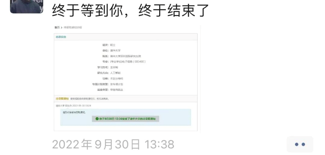 而当最终收到清华大学的待录取通知的时候,黄浩靖的反应要比他想象中更淡定一点。当天,他把通知截图出来,发了这样一条朋友圈:“终于等到你,终于结束了。”