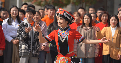 中国青年报客户端讯(中青报·中青网记者 朱娟娟 通讯员 张静)“正月是新年那,咿哟喂,妹娃去拜年那呵喂……”4月10日,在湖北省恩施土家族苗族自治州利川市柏杨坝镇永兴社区,一场充满土家民族特色的快闪活动举行。活动以“铸牢中华民族共同体意识·恩施各族人民同心共筑中国梦”为主题,民间艺术家、非遗传承人、“红领巾”和青年代表们踏歌起舞,共同庆祝恩施州建州40周年。