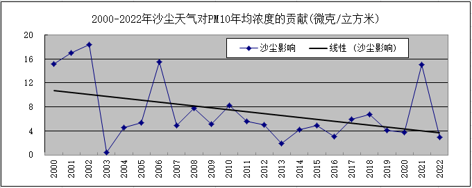 北京市生态环境监测中心首席预报员、高级工程师邱启鸿表示,从历年来北京沙尘天气空气质量监测数据看,近20年来北京市的沙尘天气及其影响趋于减少。通过对数据的分析和比较,2001年前后,监测到沙尘对PM10年均浓度的影响为10%左右,随后波动下降,到2013年仅为2%;2013年-2020年监测到沙尘对PM10年均浓度的影响为2-8%,较为稳定,但近两年出现反弹,2021年沙尘贡献15微克/立方米,占PM10年均浓度的22%。