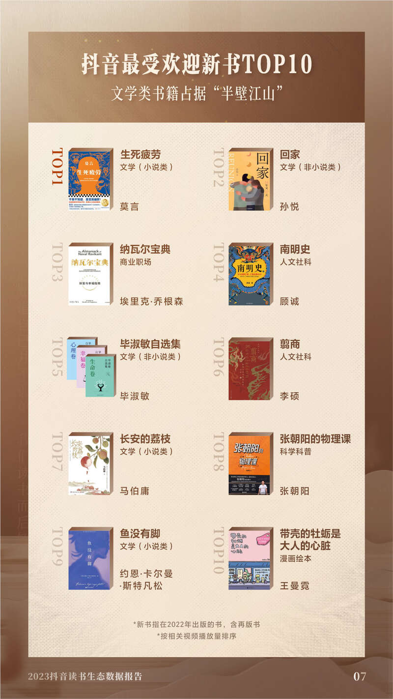报告显示,在平台最受欢迎的新书TOP10中,《生死疲劳》《长安的荔枝》等文学类书籍占据了“半壁江山”,《南明史》《翦商》等人文社科书入选。