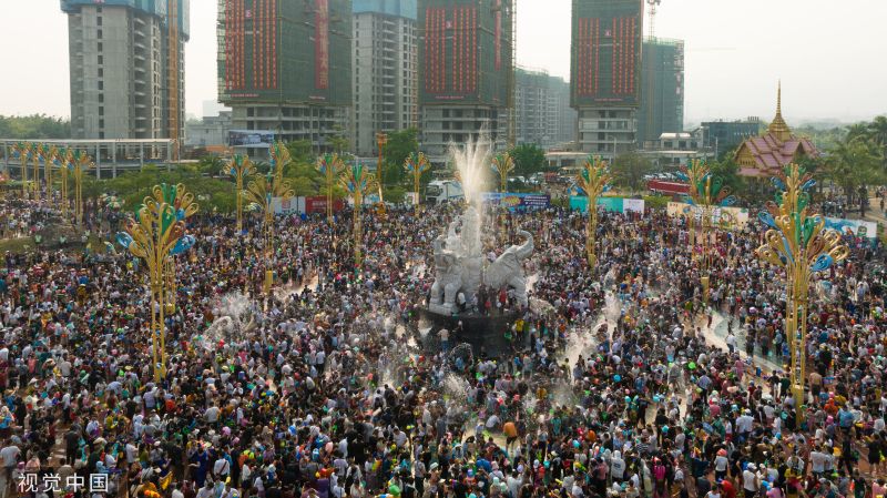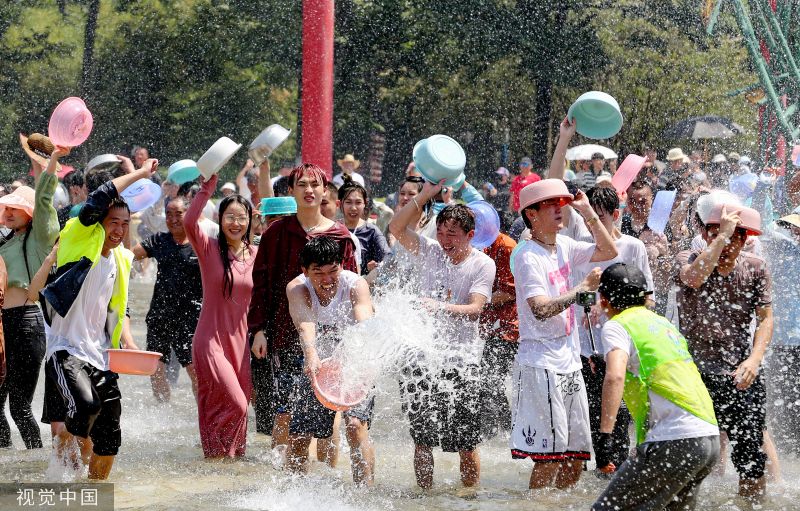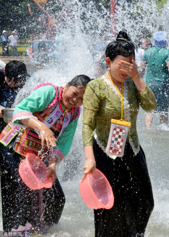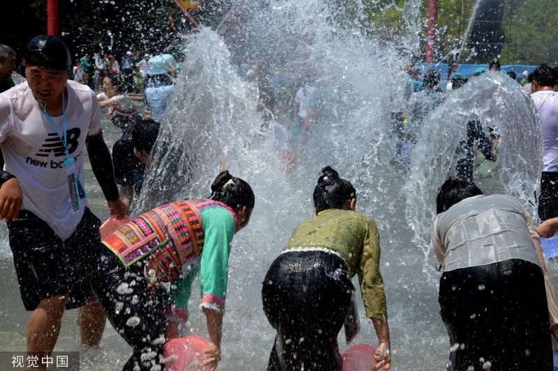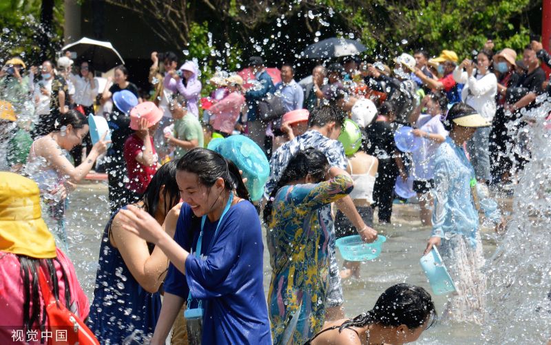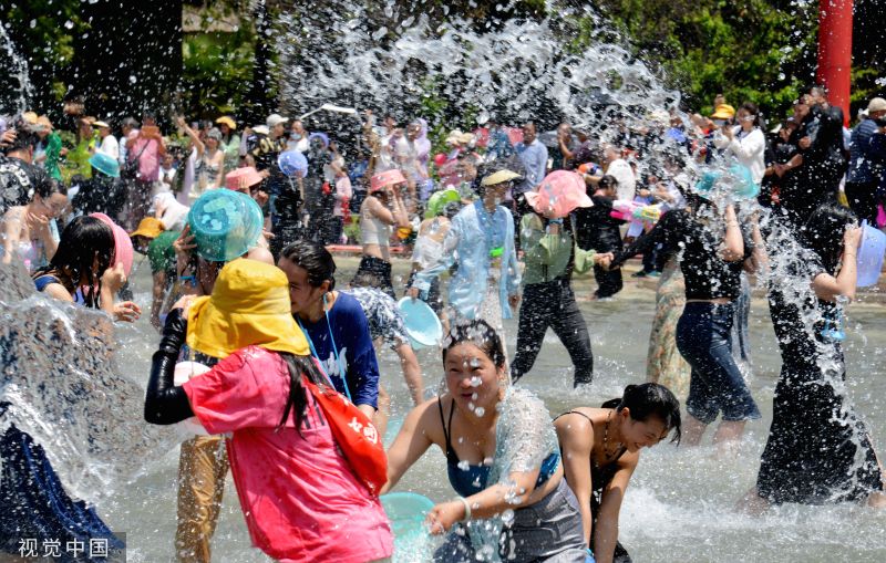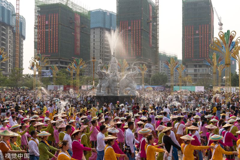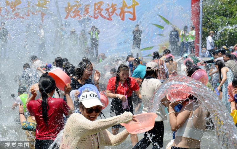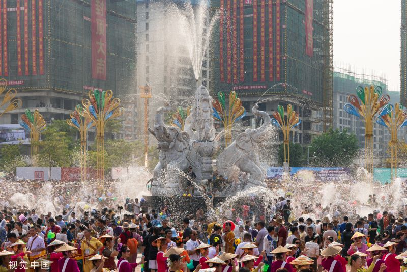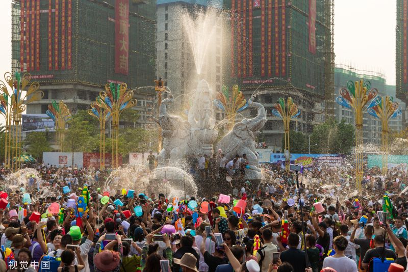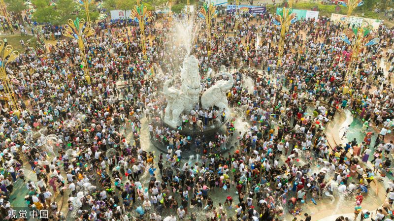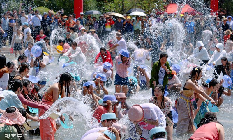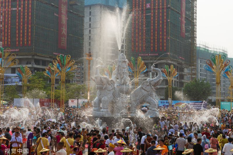 2023年4月14日,云南省昆明市,游人在云南民族村民族团结广场参加泼水狂欢。