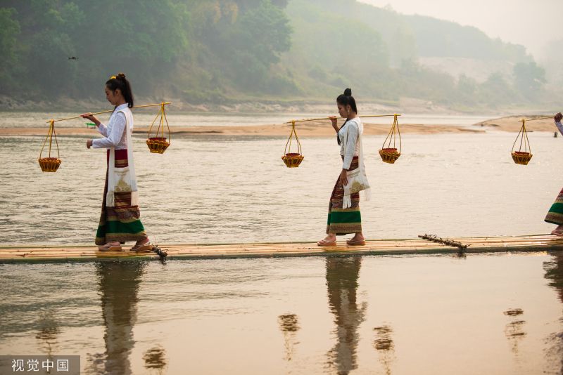2023年4月14日,云南省瑞丽市隆重举办泼水节。傣族姑娘在瑞丽江举行取水仪式。