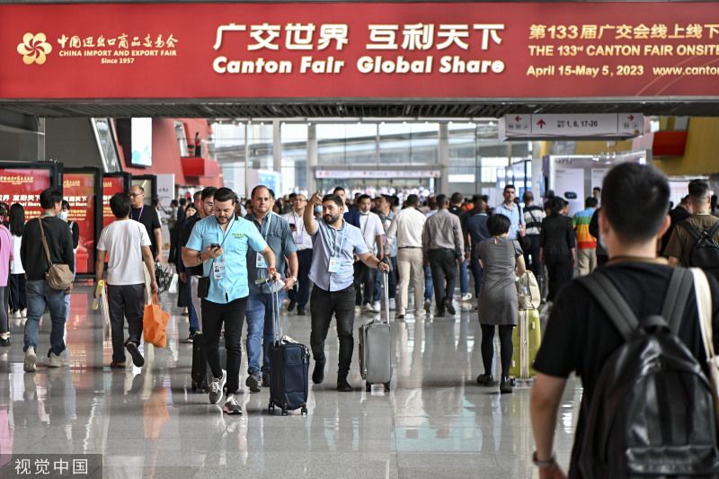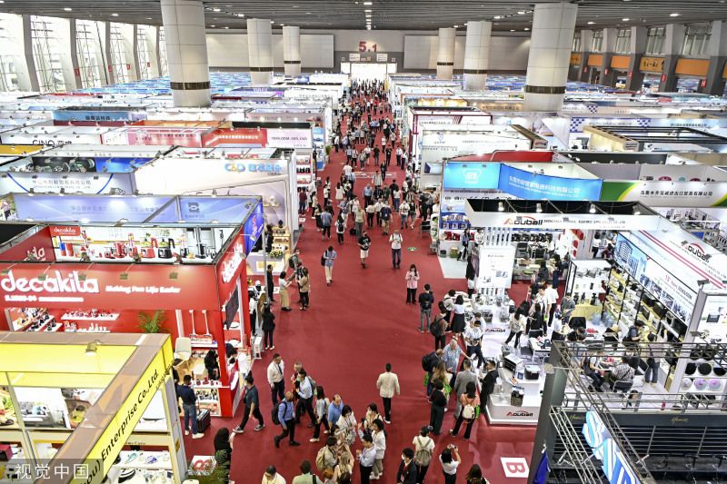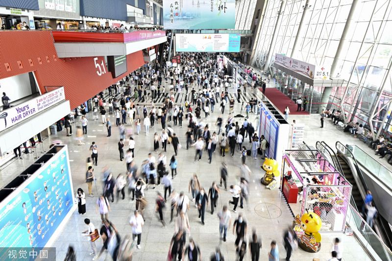 本届广交会增设“工业自动化及智能制造”“新能源及智能网联汽车”“孕婴童用品”3个新展区,以及“智慧生活”“银发经济”“检测和防护用品”3个新专区,在保持16大类产品基础上,展区数增至54个,专区数增至159个。图为广交会展馆内的参展人员。陈骥旻 摄