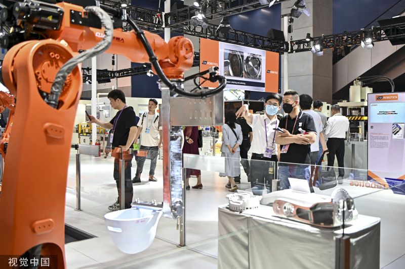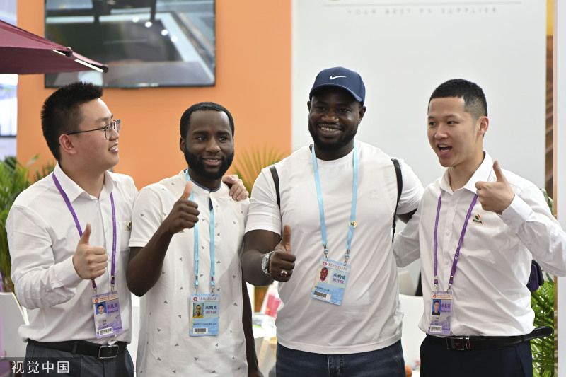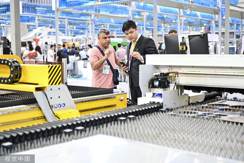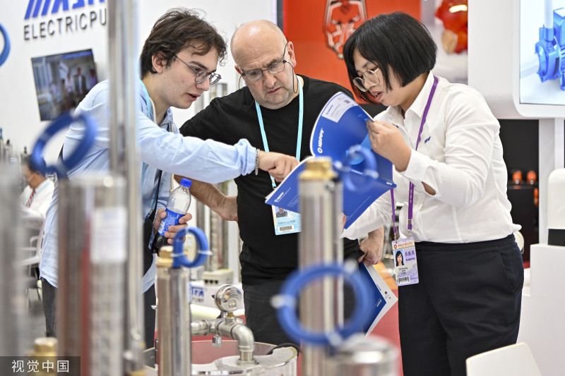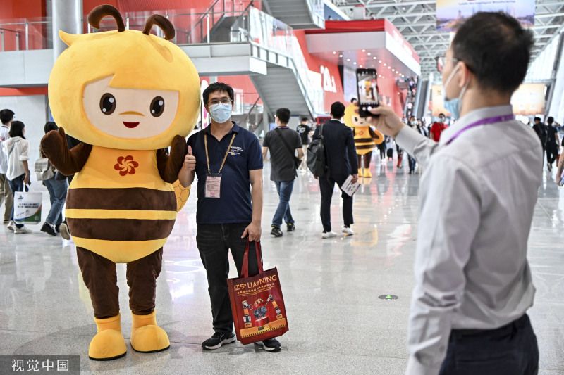 展览总面积从118万平方米增至150万平方米,展位数量从6万个增至近7万个。线下展企业从2.5万家增至34933家,新参展企业超过9000家,线上展企业达到39281家。图为采购商在“新能源及智能网联汽车”展区参观。陈骥旻 摄