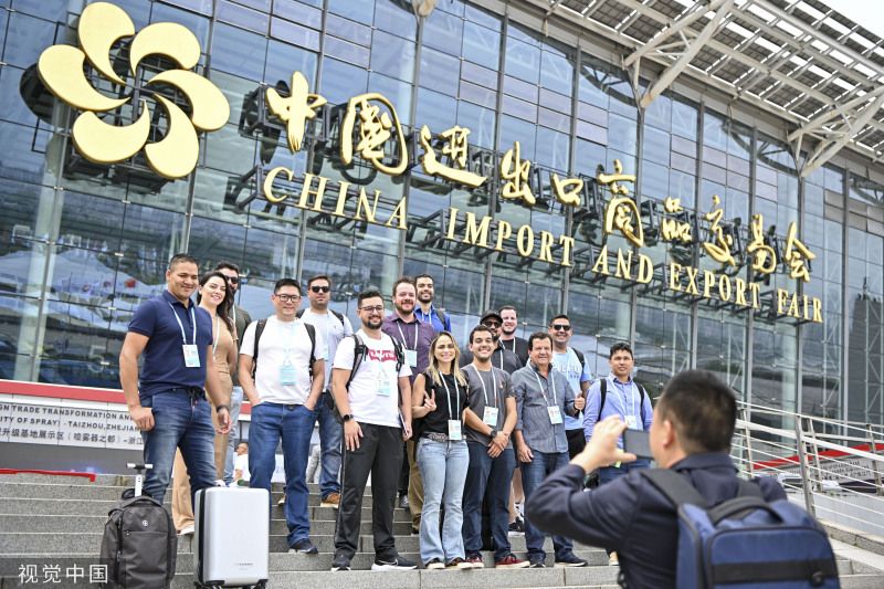 4月15日,第133届广交会开馆迎客,全面恢复线下展。据介绍,本届广交会于4月15日至5月5日分三期举办,同时全年常态化运营线上平台,是历史上规模最大的一届广交会,展览面积和参展企业数量均创历史新高。图为来自巴西的采购商广交会展馆外合影。陈骥旻 摄