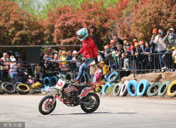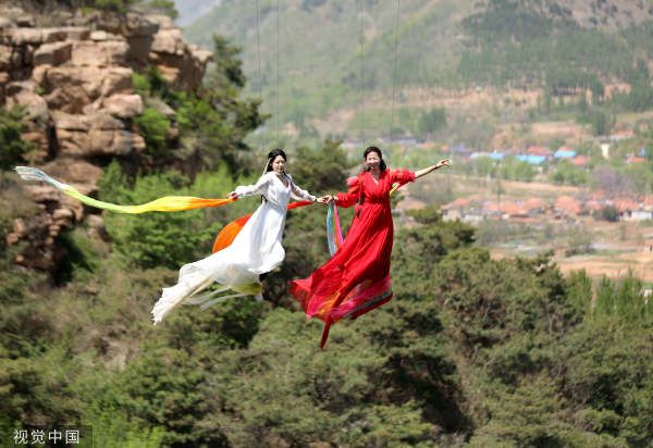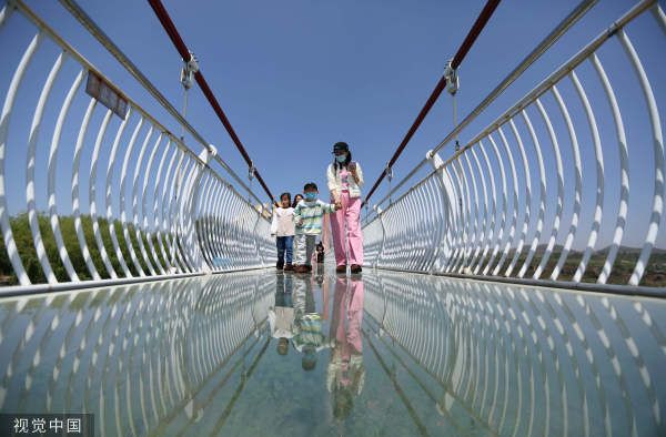 2023年4月16日,山东省临沂市,游客在沂南县红石寨景区体验高空玻璃吊桥。