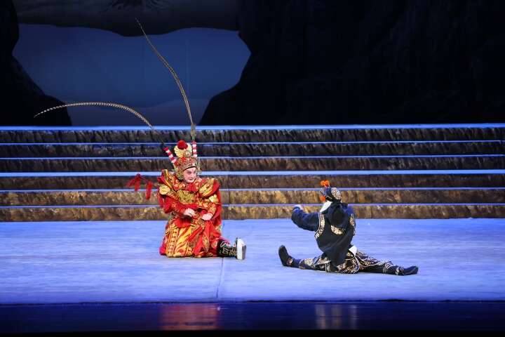 舞台上,主演们把南派京剧武戏功底和武打技巧充分融合,巧妙运用快捷迅猛的武戏手段和高难度表演,载歌载舞、满台飞跃,舞出了班超的豪迈气质和铿锵激情,打出了班超的人物心态和谋略智慧。通过京剧武戏文唱、古戏今唱,京剧艺术、民族艺术相交融的表演手法,生动细腻地展现出班超夫妻二人内心的真情流露。令人眼前一亮的还有与京剧武戏并行的新疆歌舞,主创团队在体现民族元素时,借角色身份和特点自然引出京剧唱腔和疆味音乐,将《班超》的地域风情鲜明地呈现出来,引来阵阵掌声。