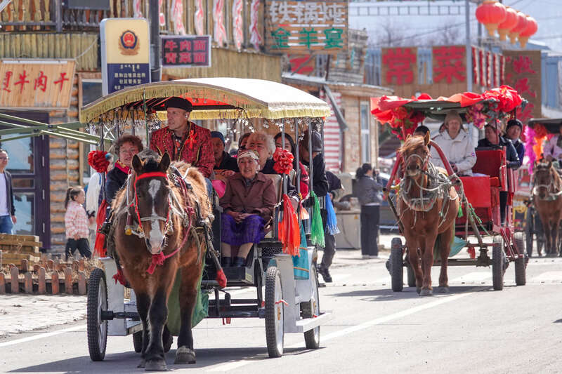 俄罗斯族群众乘坐马车前往广场欢庆巴斯克节。吕俊昊/摄