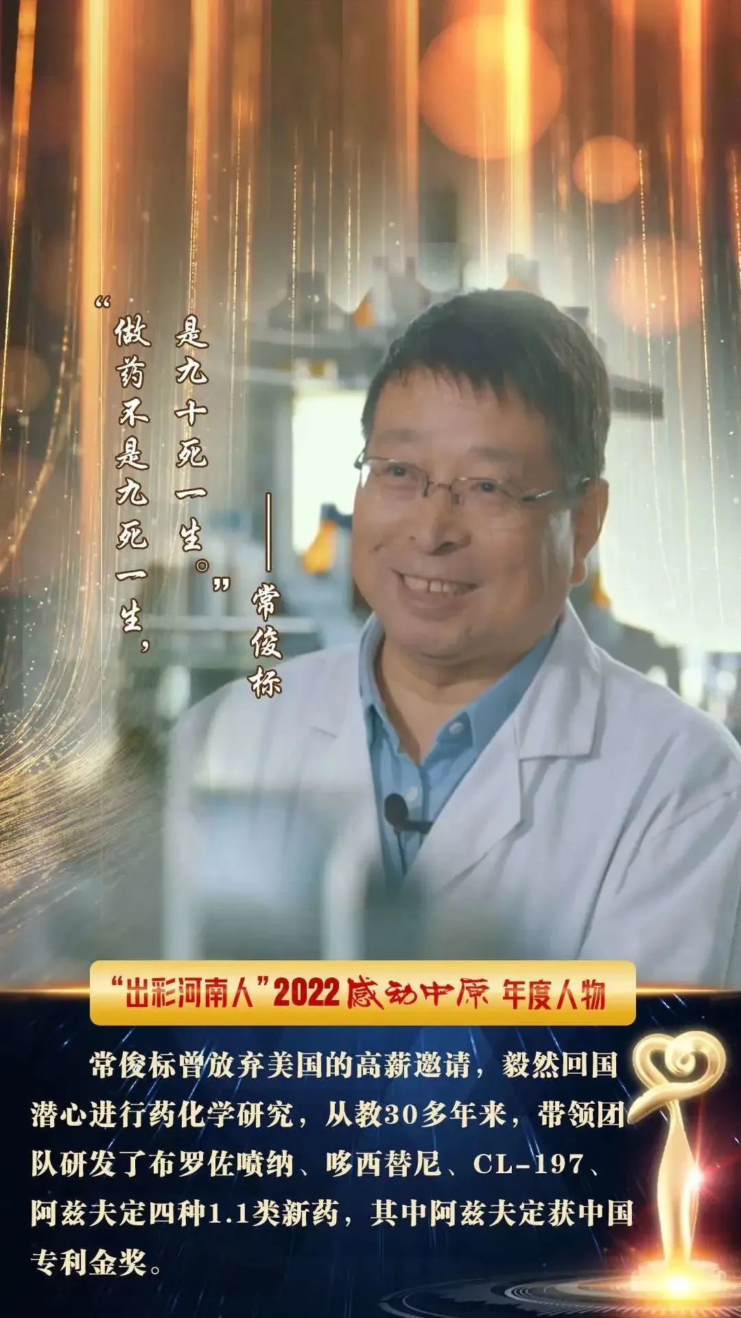 感动中原组委会授予常俊标教授颁奖词:心怀国之大,药物研发蕴创新。科研先锋,你的名字闪耀在为国为民的广阔天地。莫负今朝,筑梦时代,奋楫扬帆向未来。