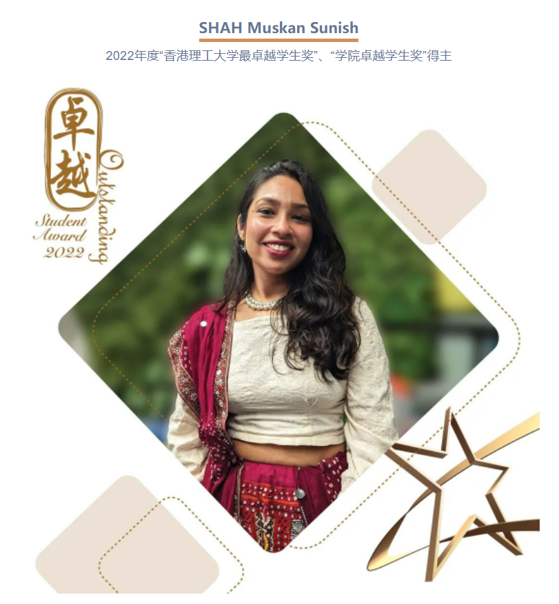 来自时装及纺织学院的SHAH Muskan Sunish凭借优异表现,不仅被评选为该学院的卓越学生,更获得了2022年度“香港理工大学最卓越学生奖”的最高荣誉!