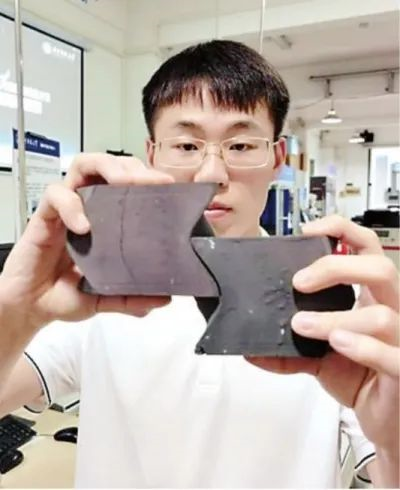 华中大团队已制备出国内首个模拟月壤真空烧结打印样品。图为团队成员展示他们打印的有榫卯结构的月壤砖。
