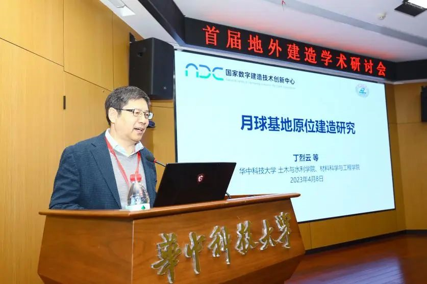 中国工程院院士、华中科技大学教授、国家数字建造技术创新中心首席科学家丁烈云作题为《月球基地建造研究》的报告。报告系统分析了月面建造方案中结构、材料及工艺装备的国内外研究现状,提出了制约月球科研站建造的三个关键科学问题,并展示华中大团队在月球建造领域的发展历程以及取得的相关进展。