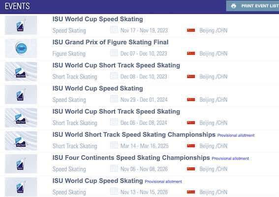 据统计,上述11项赛事中,包含短道速滑赛事5项,速度滑冰赛事5项,花样滑冰赛事1项。其中,2023/2024赛季将举办3项,2024/2025赛季将举办3项,2026/2027赛季将举办5项。