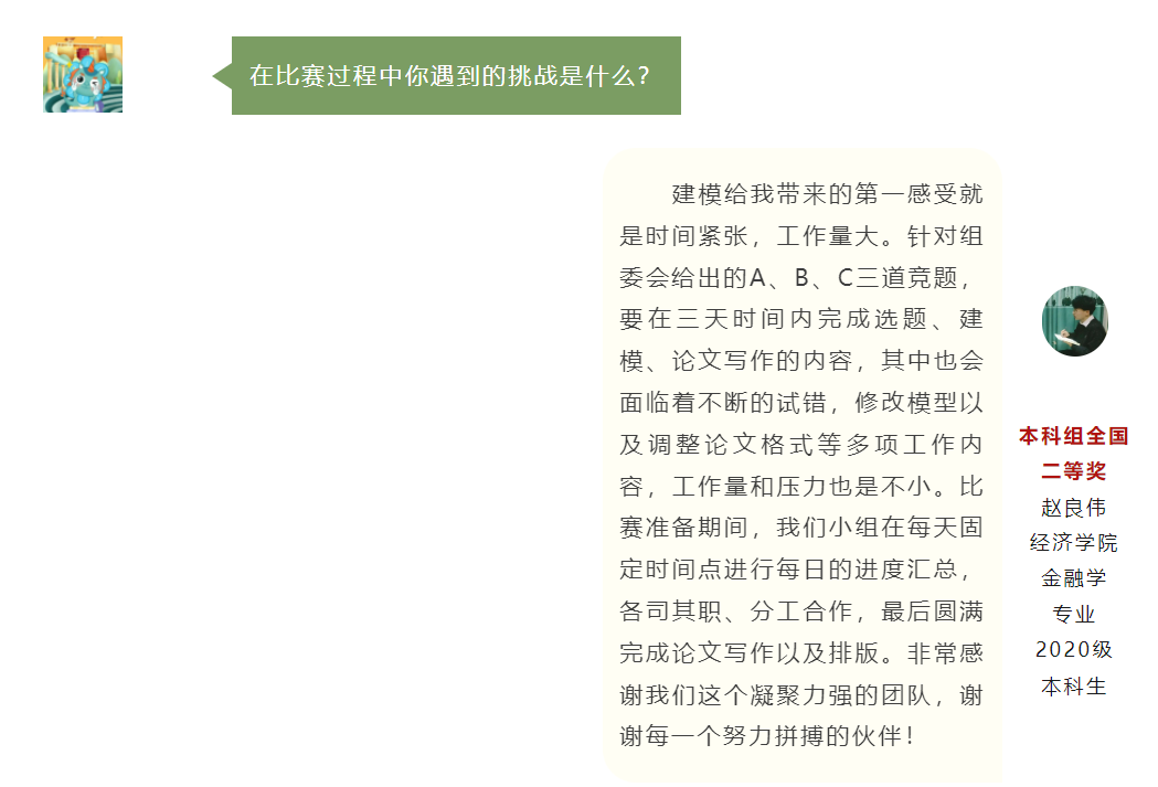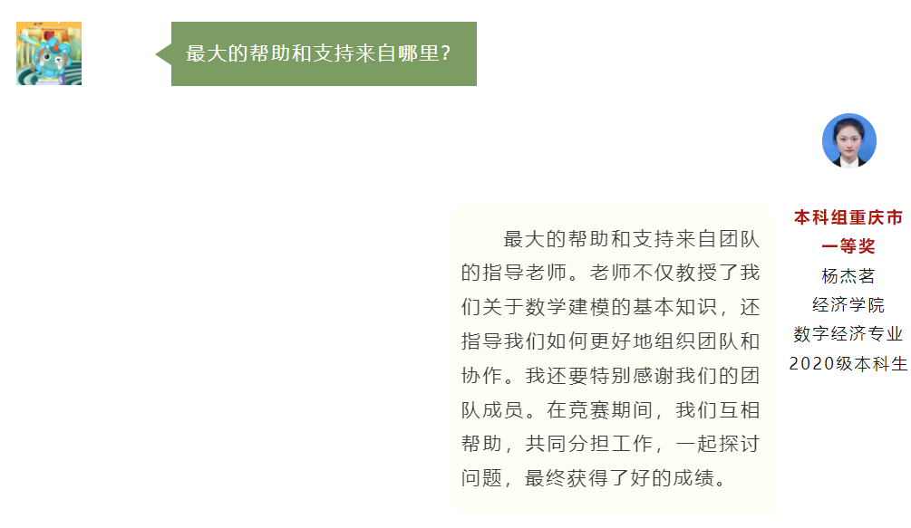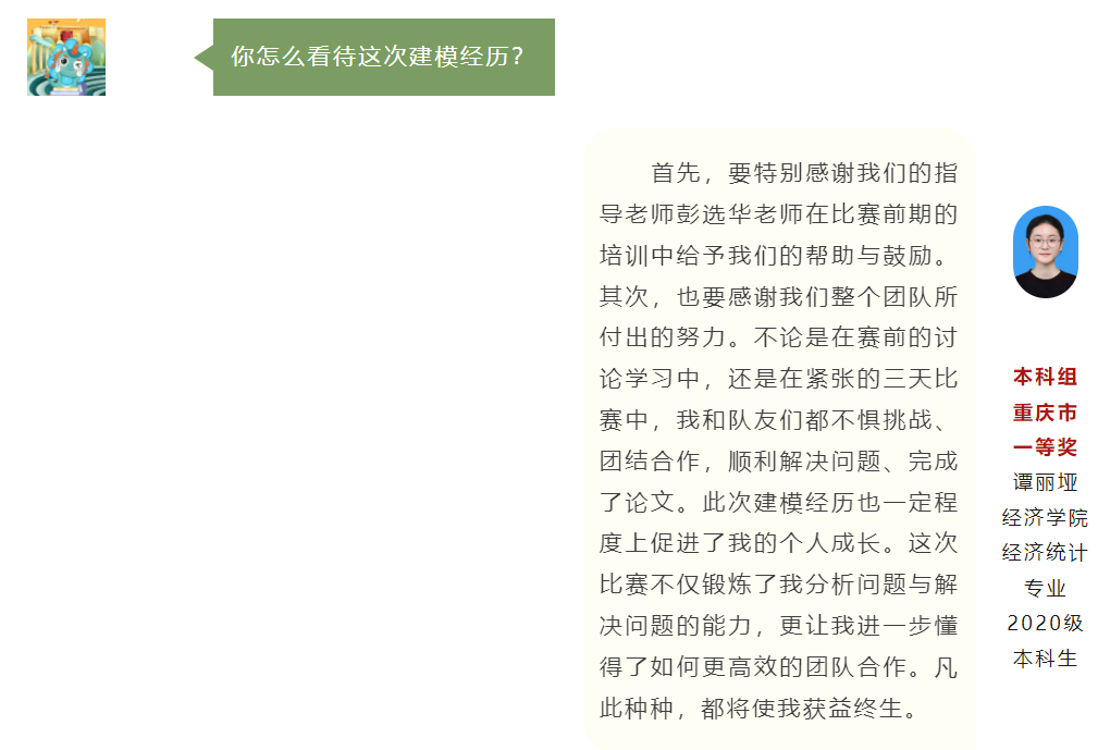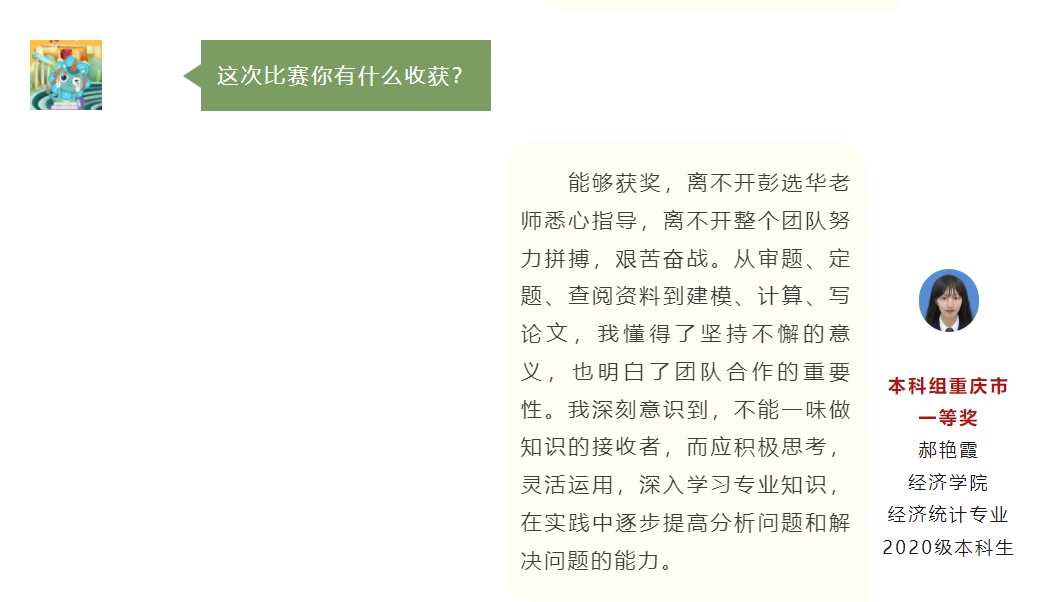 对数学建模竞赛进行广泛宣传后,指导教师和学生团队进行双向选择,最终确定了参赛团队。在暑期,大家进行了为期近两个月“线上+线下”相结合的培训学习,同学们一边进行专业实习,一边学习数学建模知识,不畏重庆夏热酷暑,拼搏创新,为成绩的取得打下了坚实的基础。“参赛期间,大家团结协作,连续奋战三天四夜,用智慧和汗水斩获了优异成绩。我们组最终能获得全国二等奖,我感到非常高兴,也对同学们能取得优异成绩表示祝贺,成绩的取得离不开大家辛勤付出,这也充分展现了我校学子学以致用的本领,较强的创新能力以及团队协作能力。