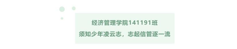 经济管理学院信息管理与信息系统专业由26名朝气蓬勃,积极向上,充满理想信念的成员组成141191班,共同为了各自的信仰而奋斗。 平均绩点在年级中遥遥领先,26名同学的平均绩点为3.8, 50%的同学绩点超4.0 。班级曾获评 “东南大学甲级团支部” 、 “东南大学红旗团支部” ,同时 提名“东南大学国旗团支部” 。