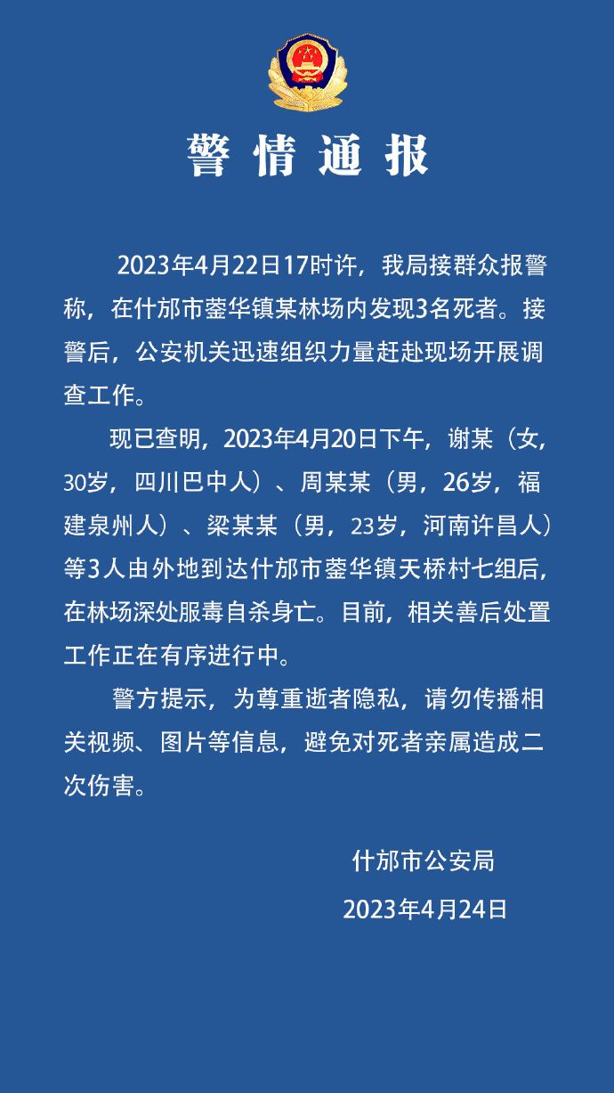四川什邡警方通报一林场内发现3名死者:来自外地,服毒自杀