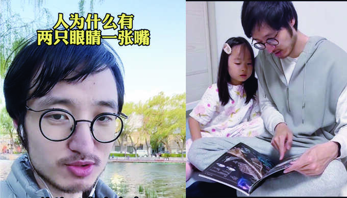 “为什么眉毛不长,头发一直长?”“人为什么有两只眼睛一张嘴?”“小猫小狗为什么没有绿色的?”……毕业于清华大学的郝博伟总是被女儿的各种问题问倒,但他毫不敷衍,从科学的角度认真回答每一个看似普通实则很难回答的问题,还做起科普视频博主,一年多来更新了200多个讲解视频,被称为“行走的十万个为什么”。近日,“清华爸爸被5岁女儿问蒙了”还冲上热搜。郝博伟曾在互联网公司做研发工程师,8年前辞职创业。接受扬子晚报紫牛新闻记者采访时,郝博伟表示,女儿的“十万个为什么”唤醒了他的愿望清单——用视频的形式给孩子们做科普,这让他意外成了科普达人。