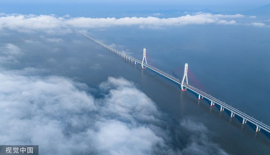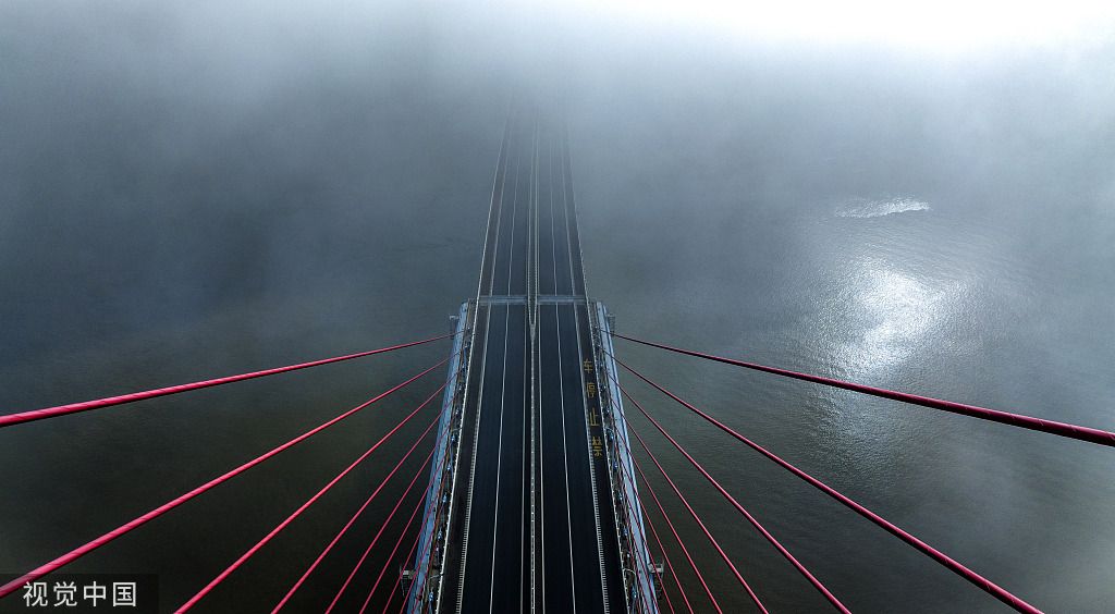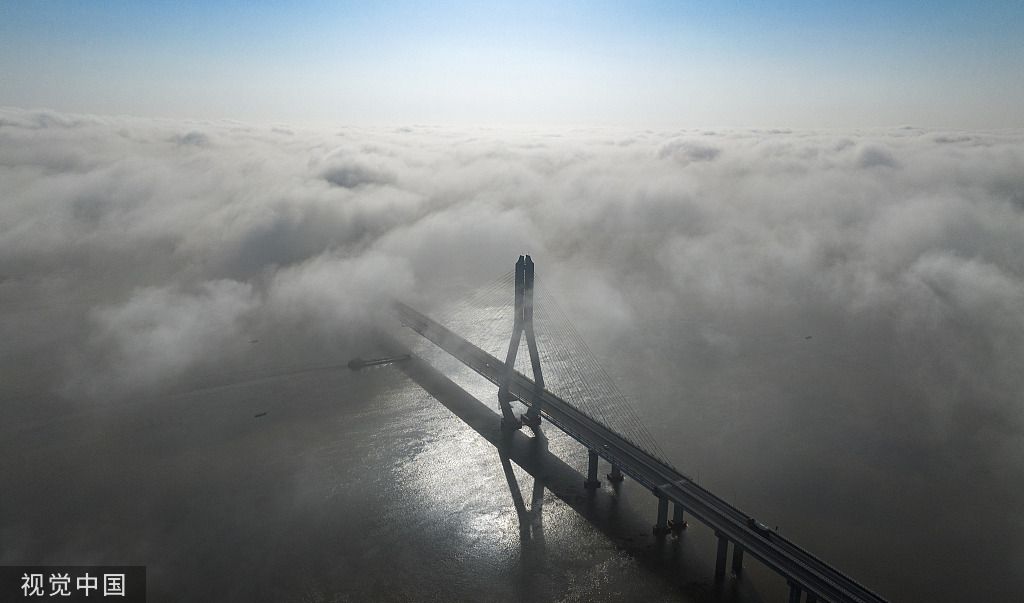 4月26日,江西九江,都昌县出现平流雾景观,鄱阳湖二桥笼罩在云雾中,若隐若现,如同仙境。