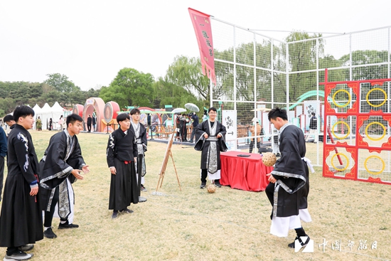 北京主会场现场设置了“国风市集”“互动体验”“文化展演”和“文化讲堂”等展示区域。在“国风集市”上,多所高校和近30家商家现场展示非遗文化、华服及饰品,给游客带来直观的传统文化体验。在“互动体验”区,年轻人体验和学习蹴鞠、投壶、棋艺、采选、品茶、糖画等传统技能,还有高手现场行“飞花令”,猜谜对诗,切磋琢磨。
